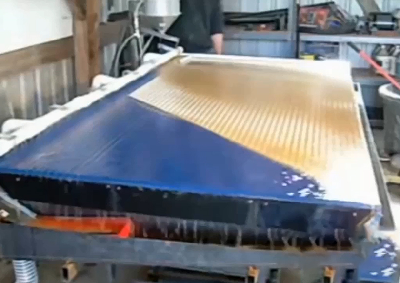 6-S Gold Shaking table, sometimes also known as wet tables, consist of a vibrating riffled deck mounted on some type of support. A motor, usually mounted separately off to the side, drives a small arm that shakes the table along its length. The riffles are usually not more than half an inch high and cover only about half the table surface. Varied riffle designs are available for specific types of applications. Shaking tables are very efficient in recovering heavy minerals from minus 100 microns (150 mesh) down to 5 microns in size.